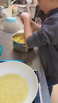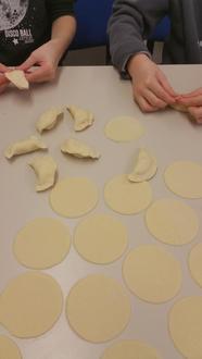 Gemeinsam ging es ans Werk: Zuerst wurden Kartoffeln gekocht, zerstampft und mit fein geschnittenen, angedünsteten Zwiebeln vermischt – trotz der unvermeidlichen Tränen beim Schneiden. Mit Salz und Pfeffer abgeschmeckt bildete die Mischung die würzige Füllung der Wareniki.