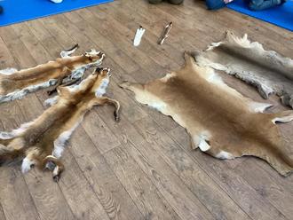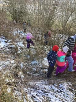 Am Dienstag, den 14. Januar, hatten die Vorschulkinder wieder Besuch vom „Haus der schwarzen Berge“. Durch Herrn Fromm erfuhren die Kinder, wie sich die Tiere auf den Winter vorbereiten. Manche Vögel fliegen in den Süden - das sind die Zugvögel. Es gibt Tiere, die gehen in Winterstarre, dazu gehören Frösche, Eidechsen…. Die Eichhörnchen halten Winterruhe, zwischendurch wachen sie auf, holen sich Nüsse aus ihrem gesammelten Vorrat und schlafen wieder weiter. Dann gibt es noch Füchse,Rehe, Wildschweine, Mäuse, Wiesel…., sie gehören zu den winteraktiven Tiere. Sie bereiten sich auf den Winter vor, indem sie ihr Fell wechseln, vom Sommerfell zum Winterfell. Der Fuchs bekommt eine sogenannte Unterwolle, das Reh trägt nun ein dunkleres Fell, um so die Sonnenstrahlen als Wärme zu speichern. Und das Wiesel legt sich ein weißes Fell zu, um sich so vor den anderen Tieren zu tarnen. Es gibt einige Spuren, an denen man erkennen kann, wo sich die Tiere aufhalten. Einmal kann man sie an den Fußspuren erkennen, zum anderen an den Fraßspuren. Entdecken wir angefressene Äpfel oder halbe Nussschalen, wissen wir, hier sind Eichhörnchen oder/und Vögel unterwegs. An ihren Hinterlassenschaften können wir auch Tiere erkennen, jedes Tier „kackt“ anders. Und nicht zuletzt an ihrem Zuhause: Mauselöcher, Maulwurfshügel oder Vogelnester sind nur einige Beispiele. Mit diesem Wissen zogen die Vorschulkinder bei frostigen Temperaturen und herrlichem Sonnenschein durch die Oberleichtersbacher Flur, um auf Spurensuche zu gehen. Das Highlight war, ein Reh davonrennen zu sehen. Den Liegeplatz dieses Rehes haben die Kinder kurze Zeit später entdeckt. Bei der Spurensuche fanden die Kinder sogar einen Kiefer mit Zähnen von einem Wildschwein! Dieses Gebiss wurde natürlich mit in den Kindergarten genommen, um es den anderen Kindern zu zeigen. Die Vorschulkinder erkannten: Es gibt viel in der Natur zu entdecken, wenn man die Augen offen hält!