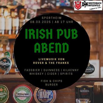 Die DJK Breitenbach-Mitgenfeld lädt herzlich zum Irish Pub Abend am 08.März 2025 ins Sportheim Mitgenfeld ein. Ab 17 Uhr erwartet euch ein geselliger Abend mit Live-Musik, kühlen Getränken und bester Stimmung.