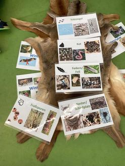 Nicht alle Tiere sind im Winter unterwegs. Manche Tiere halten Winterschlaf, wie zum Beispiel die Haselmaus - von ihr kann man aber vielleicht einen Schlafplatz finden. Das Eichhörnchen ist eines der Tiere das Winterruhe hält, es schläft die meiste Zeit und wird nur zum Fressen wach. Unser Freund der Rotmilan sowie auch ein Storch können wir im Winter nicht finden, denn sie machen Winterflucht, das bedeutet sie fliegen in den Süden über die Wintermonate. Bienen, einige Käfer und Schnecken halten im Winter eine Winterstarre. Am meisten können wir zu dieser Jahreszeit Tiere sehen oder ihre Spuren entdecken von Tieren die winteraktiv sind, das heißt sie bekommen ein warmes Winterfell und fressen sich Speck an, dass sie im Winter nicht frieren. Hierzu hatte Simone uns auch ein Winter- und ein Sommerfell von einem Reh mitgebracht. Dabei ist uns aufgefallen, dass sich die Farbe etwas verändert für die bessere Tarnung in ihrer Umgebung.