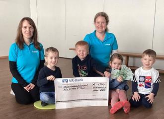 Sabrina Heck und Carolin Eigerdt vom Basarteam überreichten nun kürzlich im Morgenkreis das Geld an die Kindergartenkinder und den St. Johannesverein als Träger des Kindergartens.
