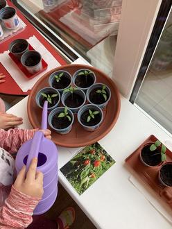 Da es Anfang April immer noch zu kalt ist, um direkt etwas in unser Hochbeet zu säen, ziehen wir einige Pflanzen auf der Fensterbank vor. So haben wir die wärmeliebenden Pflanzen Gurken, Tomaten, Paprika und Kürbis drinnen in kleine Töpfe ausgesät. Nach kurzer Zeit zeigte sich bereits etwas Grün und zwei Blätter entfalteten sich. Nun können wir täglich beobachten, wie die kleinen Pflanzen wachsen...natürlich müssen wir sie dafür regelmäßig gießen!