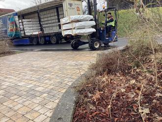 Die Anlieferung sorgte bei den Kindern für Begeisterung: Ein großer LKW hielt an der Straße vor unserem Kindergartengebäude. Ein angehängter Gabelstapler wurde heruntergelassen und mit diesem brachte der LKW-Fahrer nun die Palette mit den zerlegten Hochbeeten in unsere Zufahrt.