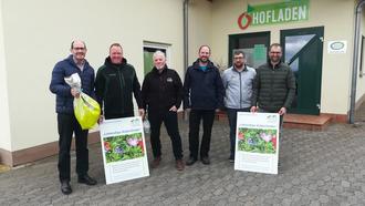 Bu: v.l.: Dieter Muth, 1. Bürgermeister Oberleichtersbach übergibt das Saatgut für die Blühflächen an Jochen Müller, Manfred Will, Manuel Vogler, Nikolas Paul (Imker) und Volker Roth.