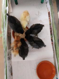 Sechs kleine Küken scharen sich ums Futter.