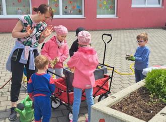 Frau Knüttel, dritte Bürgermeisterin, Vorsitzende des Obst-und Gartenbauvereins und Erstklassmutter bepflanzte gemeinsam mit Jano, Tiago, Amelie, Mara und Nils die drei Blumenkübel vor der Schule.
