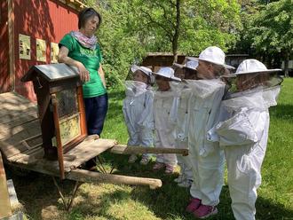 Ausgestattet mit entsprechender Schutzkleidung erfuhren die Kinder viel Wissenswertes über die Honigbiene. Zum Beispiel fliegen Bienen sehr schnell und sind mit ca. 20 km/Std. unterwegs. Bienen stechen nur wenn sie geärgert werden und nach einem Stich sterben die Bienen, durch den Verlust eines Körperteils, meist selbst.