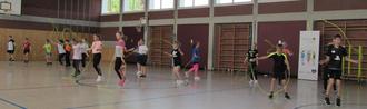 Die Halle füllte sich, die Spannung stieg: Mit fetziger Musik und rhythmischem Klatschen wurden wir von den 1.-, 2.- und 3.-Klässlern angefeuert und zeigten, was wir innerhalb der 90 Minuten gelernt hatten. Am Ende dieses außergewöhnlichen Bewegungstages durften alle Kinder der Schule die vielfältigen Sprünge ausprobieren. Von Skipping Hearts zur Verfügung gestellte Karten erklärten die Sprünge.