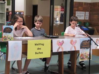 Am Montag, den 26. Juni lasen immer drei Kinder aus einer der vier Klassen in der Aula aus dem Buch „Tafiti und ein heimlicher Held“ vor. Geschrieben hat das Buch Julia Boehme und die farbigen Illustrationen stammen von Julia Ginsbach.
