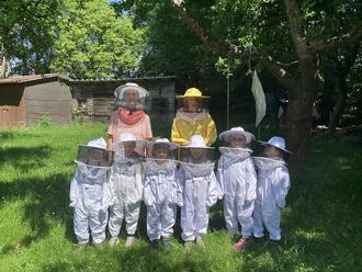 Geschützt im Imkeranzug durften die Kinder ganz nah an den Bienenstock heran und konnten so das Treiben und Summen vor dem Bienenstock beobachten und hören. Beim genauen Hinsehen erkannten die Kinder gelbe kleine Kügelchen an den Füßen der Arbeiterbienen. Das war das Futter, welches sie in den Bienenstock brachten.