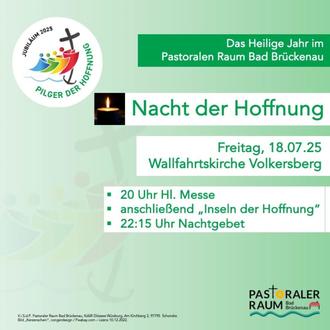 Nach der Heiligen Messe um 20 Uhr (musikalisch besonders stimmungsvoll gestaltet) gibt es verschiedene "Inseln der Hoffnung" (Lieder singen, kreatives Gestalten, Texte schreiben, Bibelgespräch, Meditation usw.). Ende gegen 22:30 Uhr