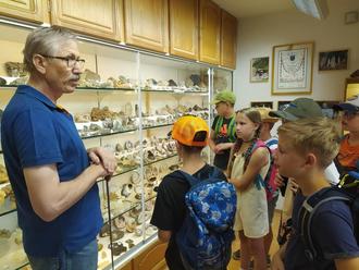 Am 18.07. ist die vierte Klasse der Grundschule gleich morgens zum Schulstart zu einem Wandertag nach Breitenbach aufgebrochen. Wir haben Herrn Heck besucht, der uns einen Einblick in sein außergewöhnliches Hobby gegeben hat. Herr Heck sammelt schon seit 34 Jahren Steine, und zwar ganz besondere. Er hat unglaublich viele Funde im Steinbruch Oberleichtersbach gemacht, dabei auch Steine und Versteinerungen, die mehrere Millionen Jahre alt sind. Herr Heck hat bei sich zu Hause fast überall Steine, schon vor seinem Haus einen ganz besonders großen, zweiseitig gewachsenen Tropfstein. In seinem Haus hat er ein richtiges Museum eingerichtet mit beleuchteten Vitrinen, in denen er tausende verschiedene Steinfunde ausgestellt und beschriftet hat. Ein Großteil seiner Funde stammt aus Oberleichtersbach und Umgebung. Zu ihnen zählen z. B. Tropfsteine, Japsis mit Quarz, Bleiglanz und andere Mineralien aus der Rhön. Aber auch versteinerte Nashornknochen, Wildscheinzähne, Fossilien, Holzreste und sogar einen Nothosaurierzahn hat er uns gezeigt. In seinem Garten hatte er ein großes Mikroskop für uns aufgebaut, durch das wir uns kleinste Fossilien und Schnecken anschauen konnten. Ein paar der Funde von Herrn Heck waren so besonders und neu, dass sie sogar seinen Namen bekommen haben. Keiner von uns Kindern wusste vorher, dass es in Breitenbach so ein tolles und interessantes Steinmuseum gibt.