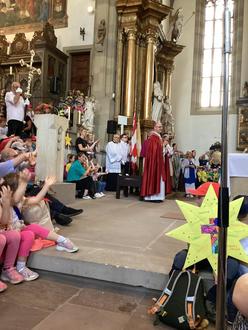 Ein Meer von gelben Sternen füllte die Pfarrkirche Sankt Burkard im Würzburger Mainviertel. Sie trugen Aufschriften wie „Pass auf uns auf“, „Glücksstern“ oder „Dass Frieden herrscht auf der Welt“. Rund 1300 Kinder mit Begleitpersonen aus Kindertageseinrichtungen aus den Landkreisen Bad Kissingen, Rhön-Grabfeld und Haßberge hatten sie extra für die Kiliani-Wallfahrt der Kindergartenkinder am Freitag, 12. Juli, gebastelt. Und mitten unter ihnen war auch unser Kindergarten mit 17 Kindern, die 2025 eingeschult werden!