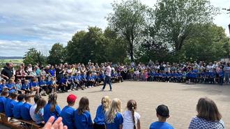 „Ich bin überwältigt über die Anzahl unserer Gäste.“ leitete Rektorin Sabine Oschmann-Hockgeiger in das Jubiläumsfest zum 50jährigen Bestehen des Gebäudes der Grundschule Oberleichtersbach ein. Im Jahre 1974, und damit vor 50 Jahren, wurde das Schulgebäude noch als Volksschule an seinem jetzigen Standort feierlich eingeweiht. Das Schulfest war zugleich auch das Finale einer Tanzprojektwoche der Schülerinnen und Schüler, so dass Rhythmus und Bewegung den Rahmen der Veranstaltung gaben. Den Festauftakt bildeten die Kinder der großgemeindlichen Bläserklasse, die einige Musikstücke aus ihrem Portfolio zum Besten gaben. Danach hießen die Schülerinnen und Schüler der Grundschule mit ihrem Jubiläumslied „Karibu Sana“ alle Besucher herzlich willkommen.