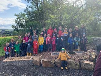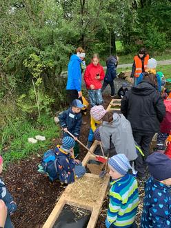 Das Regenwetter trübte zwar die gute Stimmung nicht, doch machte es ein sofortiges Ausprobieren des Pfades leider nicht möglich. Viele der Kinder planten in diesem Zuge aber bereits ihren nächsten Ausflug zur Plattform. Zurück am Spielgarten gab es zum Schluss noch eine Stärkung für die fleißigen Kinder und Dank einer Spende der Staatl. Mineralbrunnen AG reichlich Getränke.