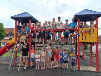 An der Zahl durften wir 39 Kinder auf dem Gelände des Spielplatzes neben der Kirche begrüßen. Mit Begeisterung haben alle Kinder den aufgebauten Parcours, bestehend aus den Disziplinen Dosenwerfen, Tauziehen, Eierlauf und Sackhüpfen absolviert, nach welchen noch Holzwimpel mit bunten Farben nach Herzenslust bemalt werden konnten. Die Kinder wurden dabei nicht nur kreativ und hatten sichtlich viel Spaß – die Wimpel zieren fortan auch das Spielehäuschen unseres Spielplatzes. Eine Wasserschlacht und leckeres Eis machten das Ferienprogramm für die Kinder perfekt und sorgten an diesem besonders heißen Tag für gelungene Abkühlung, bevor sich die Kinder gestärkt mit Hotdogs wieder auf den Heimweg machten.