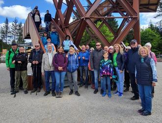 Der kürzlich eröffnete Aussichtsturm am Pressecker Knock erlebt derzeit einen Besucheransturm. Wie könnte man aber das neue Wahrzeichen des Frankenwaldes besser kennen lernen, als wie bei einer persönlichen Führung vom Architekten des Bauwerks. Fast 30 Wanderfreunde waren der Einladung gefolgt und lauschten den Ausführungen unseres Mitgliedes Kersten Schöttner, der das Projekt „Naturerlebnis Wäldla“ erläuterte und einen Blick hinter die Kulissen eines derartigen Großprojektes aus Sicht eines Planers ermöglichte. Sein ideengebendes Architekturbüro hatte die Vorplanungen für die elf Teilprojekte, zu denen auch der Kneipp-Park in Wallenfels gehört, übernommen. Die größte Herausforderung war zweifelsohne der weitgehend aus Stahl gefertigte Turm in Presseck, von dem eine 360-Grad-Rundumsicht möglich ist. Mit seiner termingerechten Fertigstellung ist Kersten Schöttner und seinem Team eine wahre Meisterleistung gelungen. Besonders bemerkenswert, dass man beim Turm sogar unter den geplanten Baukosten bleiben konnte, eher die Ausnahme in der heutigen Zeit. Nach dem Aufstieg auf das 42 Meter hohen Bauwerk erklärte Wanderwart Jürgen Schlee den Teilnehmern die zahlreichen Berge und Sehenswürdigkeiten, die vom Turm bei einer tollen Fernsicht gut zu erkennen waren. Selbst die Türme der Basilika Vierzehnheiligen konnte man am Horizont erkennen, ebenso den Altvaterturm am Wetzstein und die höchsten Berge im Fichtelgebirge, Schneeberg und Ochsenkopf. Nach dem Genuss des Ausblickes machten sich die Wanderer auf die fast zwölf Kilometer lange Runde am Frankenwald-Steigla „Dreierknock“. Dabei waren die beiden Schlösser von Heinersreuth sowie die Baumriesen in den umliegenden Wäldern besonders beeindruckend. Die etwas kürzere Variante führte direkt in das beschauliche Dorf Elbersreuth und von dort über den Rabengrund zurück nach Presseck, wo die evangelische Kirche aus dem 16. Jahrhundert besichtigt werden konnte. Im Gasthof „Pressecker Hof“ wurden die Wanderer bei ihrer abschließenden Einkehr bestens bewirtet. Übrigens kann man jetzt auch die Webcam des Turms am Pressecker Knock unter www.waeldla.de verfolgen, es lohnt sich insbesondere beim Sonnenuntergang in den Abendstunden mal reinzuschauen.