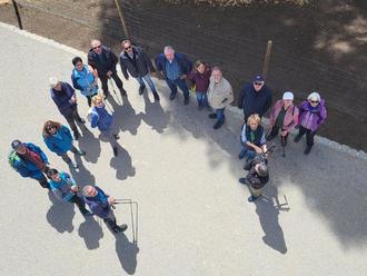 Am Fuß des Aussichtsturmes erklärte Architekt Kersten Schöttner (Bildmitte oben) den interessierten Teilnehmern die Details des Projektes „Naturerlebnis Wäldla“.
