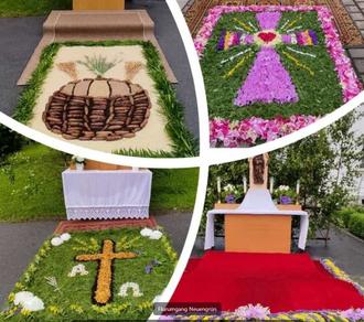 Zum Flurumgangssonntag in Neuengrün zeigten die vier Familien, die die Altäre im Runddorf betreuen, wieder kreative Ideen bei der Gestaltung der Blumenteppiche. Starke Regengüsse zu Beginn der geplanten Prozession erlaubten zwar nicht das Auswallen, aber Pfarrvikar Dominik Syga aus der Fränkischen Schweiz und die Blasmusik Neuengrün / Schlegelshaid zeigten sich flexibel und gestalteten die auf das Hochamt folgende Fronleichnamsandacht mit dem eucharistischen Segen im Gotteshaus „Mariä Himmelfahrt“, um anschließend bei einem Spaziergang unter dem Regenschirm die geschmückten Stationen zu bewundern.
