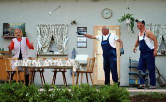Meister Günther (Udo Schlee) und sein Lehrling Roland (Andreas Gleich) erschrecken seine Frau Resi (Gaby Stöcker)
