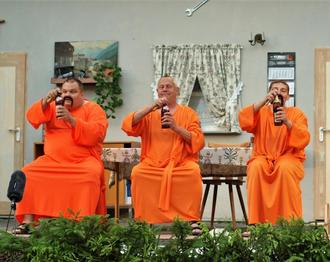 Beim Zelebrieren des „Rituals zur Bieröffnung – OM Prost“ sind sich Guru Günther (Mitte) und seine Hilfsapostel Y-Tong (Markus Haderdauer, li) und Li-Bah-Fui (Fabian Schlee) schnell einig.