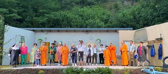 Aber das ist noch nicht genug. Für Aufregung sorgt vor allem auch die verbiesterte Schwester von Pöppels Frau Resi, die geizige Edda Krautwurst (Birgit Brehl), die nur noch zu Halloween eingeladen wird, als Satansbraten. Sie liefert sich heftige Wortgefechte mit dem „Blaukitteladonis“ Günther Pöppel. Dazu kommt noch der etwas unterbelichtete Freund des Meisters, Michel Möhrenschläger (Henry Stöcker), der des Meisters Auto in Berlin in einem Gemüseladen geschrottet hat und nun vor der Polizei flüchtet. Der ganze Guru-Wahnsinn ruft die Gemeindeschwester Dorothea Engel (Sabrina Heibl) auf den Plan, die die kampferprobte Sektenbeauftrage Dr. Gerlinde Stopfkuchen (Kerstin Haderdauer) informiert. Günthers Ehefrau Resi (Gaby Stöcker) ist inzwischen ausgezogen und will die Scheidung, der Lehrling Roland Brause muss die ganze Arbeit in der Werkstatt allein machen, weil der „Meister so „dorigegnallt“ ist und ein Chinese ist gar kein Chinese. Irgendwo taucht die chinesische Mafia auf, verschollene Bräutigame kommen zurück und der immer lächelnde Y-Tong kichert sich durch die zwei Akte. Am Ende gibt es eine überraschende Wendung und einen tollen Schlussakkord. Bei den Pöppels wird es wieder normal, die Mönche sind zufrieden und auch Tante Edda, die ihr Leben lang von Amor gemobbt wurde, hat auf einmal Glück und fällt ihrem verschollenen Bräutigam Franz Schwellnuss (Engelbert Stadelmann) in die Arme. Fazit: Ein tolles Stück mit hervorragenden Schauspielern vor einer fantastischen Kulisse. Minutenlanger Applaus war die Belohnung für tolle Unterhaltung.