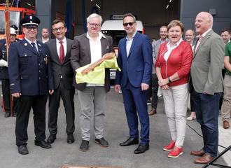 Schlüsselübergabe mit (v.li) Kommandant Ronny Reuther, Bürgermeister Jens Korn, den Architekten Gottfried Jagusch-Pezolt, Kersten Schöttner, Cornelia Schein und Franz Schönlau (BayernGrund)