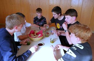 Aber bis es soweit zum Kochen war, mussten noch andere Aufgaben gelöst werden. Zum Anfang sollten die Lieblingsgerichte den richtigen Teilnehmern zugeordnet werden, hier gab es Punkte. Anschließend galt es die Zutaten zu schnappen und zwar aus einer Wanne mit Wasser, ohne die Hände zu benutzen, natürlich waren hier nur Plastikkugeln mit Zetteln im Einsatz. Schwieriger war die dritte Aufgabe, hier musste jedes Team drei Gewürze und drei Öle erschmecken bzw. verkosten. Dann ging es los, Chaos bereits beim Aufteilen der bereitgestellten Zutaten, Schnell überlegt, was wollen wir kochen und dann doch das Falsche mitgenommen. Aber irgendwie beruhigte sich das Chaos und jeder fand seine Aufgabe. Zwei Stunden Zeit hatten die Teams, um ein Vier-Gänge-Menü zu zaubern und das jeweils für vier Juroren. Und die waren schon sehr gespannt, was man ihnen vorsetzen würde. Mit Pfarrer Detlef Pötzl, Susanne Deuerling von der Presse, Carmen Schauer und Yvonne Fischer als Elternteil hatten sich durchaus kritische Esser im fein dekorierten Jurorenraum versammelt. Stilvoll gedeckter Tisch, Blumen und Kerzen vervollständigten das Ambiente. Und dann ging es los, die Vorspeise mit Salat mit Mozzarella-Sticks trat gegen Bruscetta mit Tomaten an. Beim Zwischengang gab es Pasta mit Tomatensoße und Brokkolisuppe. Überraschung beim Hauptgang, mit der Roulade hatte man bei Detlef Pötzl ins Schwarze getroffen, dies war sein Lieblingsgericht. Spaghetti Bolognese kam besonders bei Carmen Schauer gut an. Das Highlight aber waren die Desserts. Einmal Milchreis mit frischen Erdbeeren und Zimt und einmal ein Traum aus Quarkcreme mit frischen Erdbeeren. Bewertet wurden jeweils Aussehen, Geschmack und Kreativität der Gerichte. Den Titel „Gericht des Tages“ konnte das Team blau mit ihrer fantastischen Quarkcreme entgegennehmen, die mit 60 von 60 möglichen Punkten überzeugte. Zum Schluss sicherte sich das Team blau mit 288,5 Punkten den Gesamtsieg vor Team rot mit 250 Punkten und konnte „Das Goldene Schneidbrettla“ entgegennehmen und sie werden es sicher im nächsten Jahr wieder verteidigen.