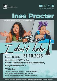 Der Förderverein Steinwiesener Fasching präsentiert am 31.10.2025 um 19:00 Uhr Ines Procter, bekannt als die närrische Putzfraa aus Fastnacht in Franken, in der Kulturhalle in Steinwiesen.