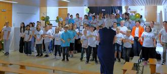 Doch nicht nur der schulische Lehrplan war wichtig für Angela Neder, nein die Heimatverbundenheit und das geschichtliche Wissen gab sie weiter, nicht nur aus dem Frankenwald, sondern auch aus der Partnerstadt Bingham in England. Und da war ja auch noch die Musik, voller Begeisterung war Angela Neder, als die erste Bläserklasse vor drei Jahren entstand. Es gäbe noch viel zu sagen und die Kinder zeigen das auch in ihren Darbietungen, die sie extra einstudiert haben. Da überraschte die Bläserklasse mit kleinen Stücken und der Kinderhort tanzte flott als Cheerleader auf der Bühne. Mit einem kleinen Theaterstück, das Lehrer und Hausmeister gleichermaßen auf die Schippe nahm, begeisterten die kleinen Künstler nicht nur die scheidende Schulleiterin, sondern auch die Ehrengäste und alle, die da waren. Aber das Schönste und Anrührendste war das Abschlusslied aller Schüler „Frau Neder, bleib dou, du wasst ja nie, wie’s hamma werd“ – da floss so manche Träne, da wischte man über die Augen und ab und zu kam auch ein Seufzer raus. Und Angela Neder? Sie war ganz ruhig und still, gar nicht wie sonst. Ein klein wenig Wehmut und viel Dankbarkeit verbargen sich dahinter.