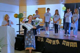 Für den Personalrat dankte Michaela Weinmann, Schulleiterin in der Grundschule Steinwiesen, der scheidenden Angela Neder auf das Herzlichste. Als Steinwiesnerin in Wallenfels zu arbeiten, dazu gehört Mut, meinte sie lachend, aber so konnte sie als „Brückenbauerin“ agieren. Kollegiales Miteinander, Teamgeist und eine offene, unaufgeregte Art, das ist Angela Neder schon immer gewesen. Als Geschenk gab es das Buch „Ruhestand für Einsteiger“, das „nicht ganz ernst gemeint war“. Dass ihr der Förderverein „BiZ for Kids“ wichtig war, das konnte die Vorsitzende Sandra Behrschmidt der engagierten Angela Neder bescheinigen. Vor 11 Jahren wurde er gegründet und seit dieser Zeit hatte sie immer ein offenes Ohr für alles. Zusammen mit den Kindern, die ein Gedicht geschrieben hatten, überreichte Behrschmidt individuelle Geschenke, die sie an die Zeit mit dem Förderverein erinnern sollten. Danke sagte auch Yvonne Deckelmann im Namen der Musikschule und der Bläserklasse. Drei Jahre gibt es diese Klasse bereits und Angela Neder hat sie immer unterstützt und deshalb waren auch alle Kinder auf der Bühne, um sich von der Schulleiterin musikalisch zu verabschieden.