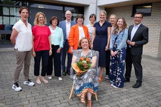 Angela Neder (sitzend) und ihr Kollegium sowie Schulamtsdirektor Ulrich Lang (4.v.li), Sandra Behrschmidt (3.v.re) und Bürgermeister Jens Korn (re)