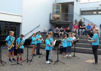 Die Bläserklasse trat in einheitlichen Shirts auf, dirigiert von Yvonne Deckelmann