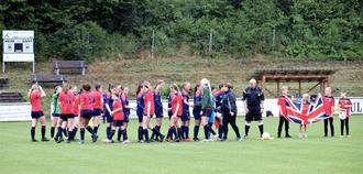 Shake Hands vor dem Fußballspiel der U18 Damen aus Bingham (in rot) und den U17 Damen des FFC Hof.
