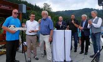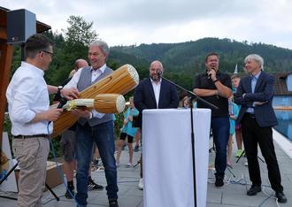 Einen großen überdimensionalen Schlüssel hatte Architekt Winfried Lebok dabei, den er Bürgermeister Jens Korn und dem Bademeister Dieter Gräf, genannt Oli, übergab. Zu groß für die Hosentasche, aber wichtig für das Bad. Aufblasbare „Baumstämme“ in Anlehnung an den Flößerort hatte Landrat Klaus Löffler im Gepäck, die sicher bei Jung und Alt für viel Spaß sorgen werden. Doch die beste Überraschung konnte Jens Korn zusammen mit dem Vorsitzenden der Flößergemeinschaft, Andreas Weiß, enthüllen – den neuen Namen des Schwimmbades. Von jetzt an heißt es offiziell „Flößerbad“, in Anlehnung an die Tradition und die Geschichte der Flößerei in Wallenfels. Und in dieses „Flößerbad“ gehen alle gerne, wie die kleine Runde mit den Kindern Enie Leipold und Moritz Ebert, beide 9 Jahre, dem technischen Leiter der Wasserwacht, Jürgen Fabritzek und der Frühschwimmerin Elfriede Detsch bekräftigten. Gerade für die Frühschwimmer ist es herrlich, nicht so voll, man trifft Freunde und kommt früh „gleich auf Touren“.