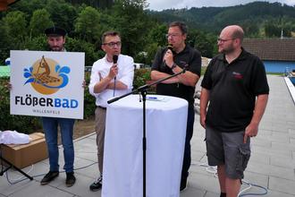 Nun steht der neue Name fest: Das Schwimmbad heißt nun offiziell „Flößerbad“, wie v. li. Andreas Weiß, Jens Korn, Thomas Apfel und Torsten Hanft bestätigten.