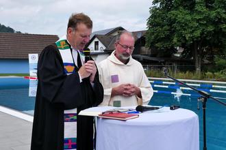 Ein neues schönes Schwimmbecken ist das Eine, unfallfreies Baden und Schwimmen das Andere. Und damit dies auch gelingen möge, holt man sich natürlich den Segen Gottes dazu, wie es nun mal im Frankenwald üblich ist und noch immer praktiziert wird. Deshalb riefen der evangelische Pfarrer Andreas Krauter und Gemeindereferent Andreas Roderer gemeinsam den Segen Gottes auf die neue Anlage herab. Ein Ort der Erholung und Entspannung wurde hier geschaffen, ein Ort für Menschen, ein Ort zum Krafttanken. Sie dankten auch Gott für die vielen Menschen, die sich hier engagierten und zum Gelingen beitrugen. Wie in der Schöpfungsgeschichte, als Gott die Wasser gebändigt und begrenzt hatte, so wird auch hier im Bad das Wasser im Edelstahlbecken begrenzt. Schon vor 3000 Jahren wurden Metallbecken mit Wasser von den Priestern genutzt, damals wie heute gab es findige Architekten und Finanzgenies, Menschen, die zusammenwirken. Mit den Fürbitten, gemeinsamen Gebet und dem Segen schlossen Andreas Krauter und Andreas Roderer die Weihe ab.
