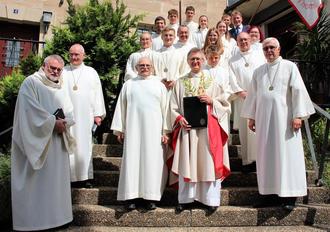 „Seine“ Ministranten lagen Pater Jan immer sehr am Herzen, sie wurden von ihm oftmals „reich“ beschenkt, die vielen Tomaten bleiben unvergessen, denn diese wachsen bei ihm so gut, dass schon spekuliert wird, ob er mit Weihwasser gießt. In Erinnerung bleibt auch das gemeinsame Gebet während der Corona Zeit. In Erinnerung an die Süßigkeiten, die es für die Messdiener als Dank nach dem Gottesdienst immer gab, wurde Pater Jan der Verdienstorden in „Zitrone und Orange“ umgehängt – eine Kette aus Nimm2-Bonbons. Zusätzlich gab es noch ein blaues Shirt der St. Thomas-Minis. Zum Schluss hatte „Mini-Papa“ Werner Stumpf noch einen Ratschlag: „Wenn es Ihnen in Bayreuth nicht gefällt, dann kommen Sie einfach wieder zurück.“
