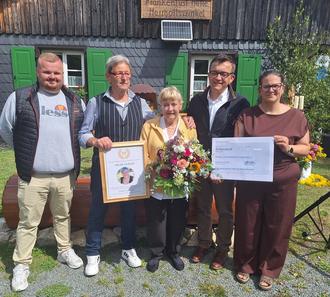 Mit einer Überraschung warteten noch der Heimatverein und Bürgermeister Jens Korn auf. Zunächst war es Vorsitzender Schlee und sein Stellvertreter Maximillian Zeitler, die die weithin bekannte und beliebte Hüttenwirtin Hilde Gleich für ihre inzwischen 60-jährige Tätigkeit auszeichneten. In der ihr übergebenen Dank- und Anerkennungsurkunde mit ihrem Konterfei stand: „60 Jahre im Dienst ihrer Gäste – die gute Fee des Herrgottswinkels! Wie man sieht, ist sie dabei erstaunlich jung geblieben.“ In den Dank an Hilde Gleich war auch Karin Gleich, die als Helferin eine wertvolle Kraft ist, mit eingeschlossen.