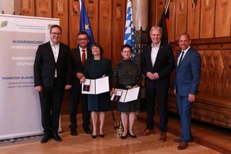 Im Landrätesaal der Regierung von Oberfranken wurden Marga Spranger (3.v.l.) und Rosi Hentschel (4.v.l.) durch Staatsminister Thorsten Glauber (rechts) mit dem Bundesverdienstkreuz ausgezeichnet. Es gratulierten Regierungspräsident Florian Luderschmid (links), Bürgermeister Jens Korn (2.v.l.) und Landrat Klaus Löffler (5.v.l.)
