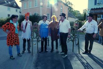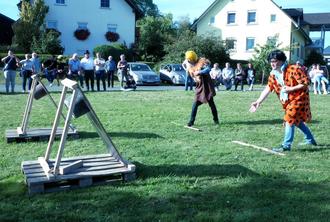 Der Wettkampf im Jahr 1 nach Pater Jan Poja. Aber wenn Bürgermeister Jens Korn dachte, nun habe er endlich leichtes Spiel, so sah er sich getäuscht. Denn die Kirche hatte den Gemeindereferent Andreas Roderer als Vertretung von Pfarrer Detlef Pötzl und Pfarrer Richard Reis in das Duell geschickt. Und der hatte zwar keine Ahnung, was ihm blühen könnte, aber er hatte von Anfang an den Mut, sich gegen den Rivalen zu stellen und zu gewinnen. Es war ein ausgeglichenes Bild beim Einmarsch der beiden Kontrahenten -Fred Feuerstein (Jens Korn) und seine Wilma (Manuel Horn) betraten zusammen mit Barney Geröllheimer (Andreas Roderer) und Frau Betty (Martin Schütz) die „Arena“. Auf dem Platz vor der Pfarrkirche war schon ein Parcours aufgebaut und nachdem die beiden Steinzeithelden ihre Frauen wie immer weit weggeschickt hatten, ging es los. Mit Katapulten, zusammengebaut aus Gummibändern und „Seihern“ musste eine „riesige Kalksteinmauer“ zertrümmert werden. Kleine Pflastersteine waren die Munition und konnten beliebig oft wiederverwendet werden. Hier ging Fred Feuerstein alias Jens Korn in Führung und konnte als erster zur zweiten Station wechseln, hier mussten kleine Steine in ein Ziel, sprich einen „schiefen Eimer“ geworfen werden. Doch Barney Geröllheimer alias Andreas Roderer war ihm dicht auf den Fersen und konnte sofort aufholen. Zack, zack waren die Steine im Eimer und er rannte zur dritten Station – ein „Ritt auf dem Dinosaurier“. Und da ging die Post ab, das schadstoffarme Gefährt mit dem beweglichen Dinokopf entpuppte sich als „Fahrrad der Spitzenklasse“ – hinten Räder, vorne Laufstangen (oder so ähnlich). Und hier bewies der Gemeindereferent, dass die Kirche eben doch in Neuengrün die Nase vorn hat. Er war trotz einer Aufholjagd durch Jens Korn als Erster im Ziel und holte den Sieg für die Kirche.