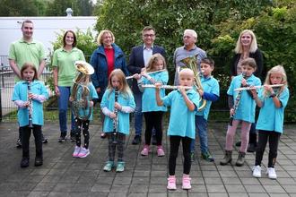 Stolz präsentieren die Kinder ihre Instrumente. Vorne von Links Marie Wolfram, Lilly-Marlen Till, Nora Krellowetz, Alexia Krellowetz, Anni Michel, Ben Stöcker, Yuna Franz und Elfie Deckelmann. Hinten von links Marius Pfaffenberger, Tina Müller (beide MV Wallenfels), Angela Neder (GS Wallenfels), Jens Korn, Ludwig Dietz (Blasmusik Neuengrün) und Yvonne Deckelmann.