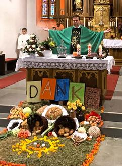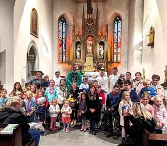 „Dank für Gottes gute Gaben“ – so lautete das Thema des Familiengottesdienstes, zu dem das KiGo-Team aus Wallenfels eingeladen hatte. „Dankbar sein“ am Erntedankfest – das war das zentrale Thema für die Kinder und ihre Familien. Und sie waren sehr zahlreich gekommen, um mitzufeiern, mitzudanken und fröhlich zu sein. Pfarrer Detlef Pötzl hieß alle herzlich willkommen und freute sich über die so schön geschmückte Kirche. Danke sagen – aber wofür? Diese Frage stand nun am Beginn der Messfeier. Dinge für die man Danke sagen kann, das sind z.B. Sonne, Wasser, Blumen und Erde. Doch hieß es auch „Danke für die Kartoffel“, denn welches Kind käme ohne Pommes oder Chips aus? In den Kyrie-Rufen wurde mit verschiedenen Fragen daran erinnert, dass Danken, Teilen und Helfen nicht selbstverständlich ist und man diese Dinge im Alltag oft vergisst. Hier kann Gott helfen und uns daran erinnern, dankbar zu sein. Dankbar sein, das sprach auch Pfarrer Pötzl in seiner Predigt an und nannte einige Beispiele. Oft sei es auch nicht so einfach. Eltern können für ihre Kinder dankbar sein, und umgekehrt Kinder für ihre Eltern – „auch, wenn sie manchmal nerven“, fügte der Geistliche augenzwinkernd hinzu.
