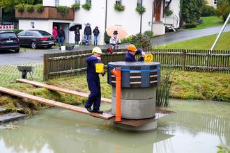 In die Fallrohre am „Wasserturm“ mussten Andreas Roderer (li) und Jens Korn (re) das Wasser einfüllen.