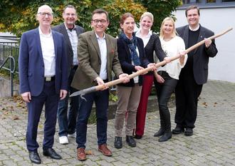 Das Ruder, pardon den Floßhaken fest in der Hand hat die neue Schulleiterin der Grundschule Wallenfels. Von links Schulamtsdirektor Ulrich Lang, Jens Schmidt (Personalrat), Bürgermeister Jens Korn, Anne Neubauer, Lisa Spranger, Sandra Behrschmidt (Förderverein) und Pfarrer Detlef Pötzl