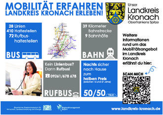Alle Informationen zum Mobilitätskonzept findest du auf der Homepage des Landkreises Kronach unter https://www.landkreis-kronach.de/wirtschaft-und-verkehr/oeffentlicher-nahverkehr/