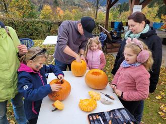 Auch die Eltern halfen mit beim kreativen Gestalten der Kürbislaternen.