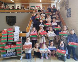 Im Rahmen eines jeweiligen Packtages in der Grundschule sowie im Kindergarten wurden anschließend die Sachspenden von den Kindern in die Schuhkartons verpackt, so dass die Aktion mit stolzen 64 Schuhkartons unterstützt werden konnte.