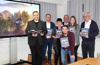 Stolz präsentieren (v.li) Dekan Detlef Pötzl, Sven Hofmann und die Autoren Annegret Hümmrich-Korn, Dieter Müller, Anna-Lena Müller, Franz Behrschmidt und Thomas Weiß (vorne) das Buch. Es fehlen Jens Korn und Werner Stumpf.