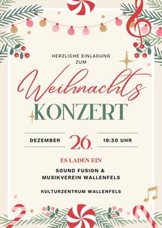 Traditionell wie jedes Jahr findet unser Weihnachtskonzert auch dieses Jahr wieder am 2. Weihnachtsfeiertag statt. Dieses Jahr wird auch unser Nachwuchs von "Sound Fusion" auftreten und Euch mit ihrem Können begeistern!